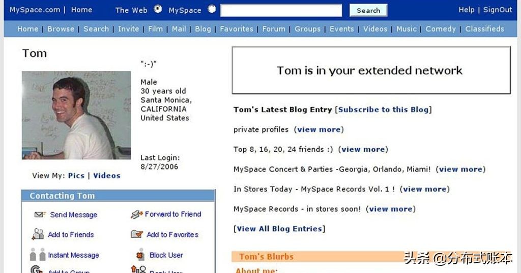 早期Web 2.0公司的联合创始人Tom Anderson的MySpace页面。Tom 是你注册 MySpace 帐户时的第一个联系人。来源。