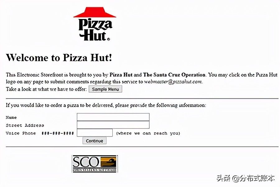 Web 1.0 披萨订购表。必胜客是Web 1.0领域的一家创新公司,因为它引入了一个客户可以用来订购披萨的网站。但是,付款必须亲自支付。来源。