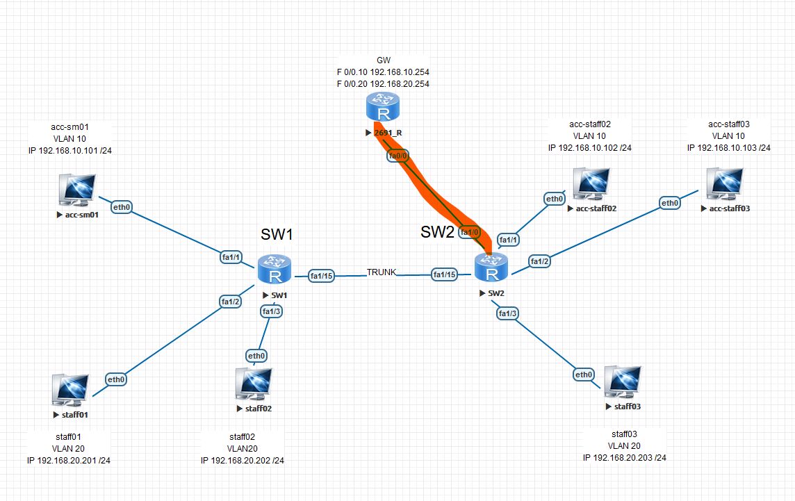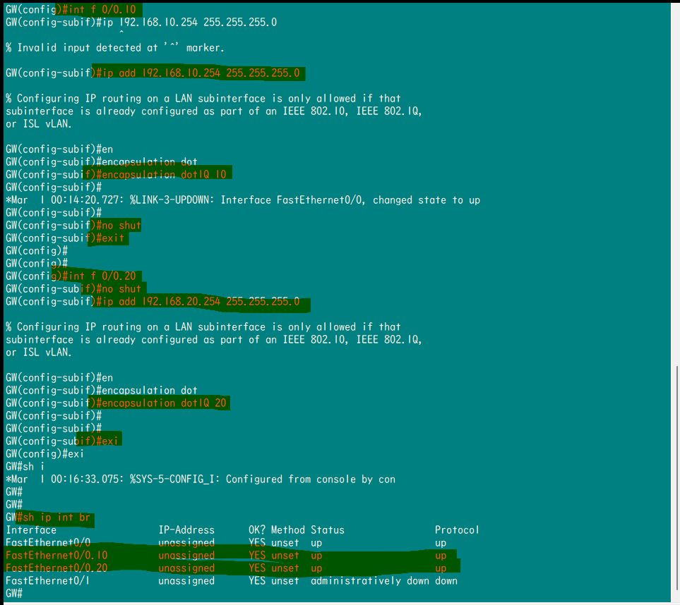 10-int f 0/0.20 --> no shut ---> en dot 20 --->ip add --->exit #配置vlan20的子端口ip,封装,vlan号