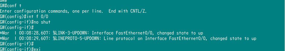 7-interface f0/0 ------> no shutdown ------> exit#开启GW的f 0/0口,保存退出