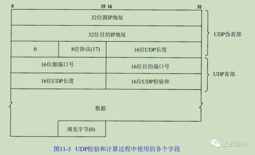 UDP数据报的长度可以为奇数字节,但检验和算法是把若干个16bit字相加。解决方法是在必要时在最后增加填充字节0,这只是为了检验和的计算。