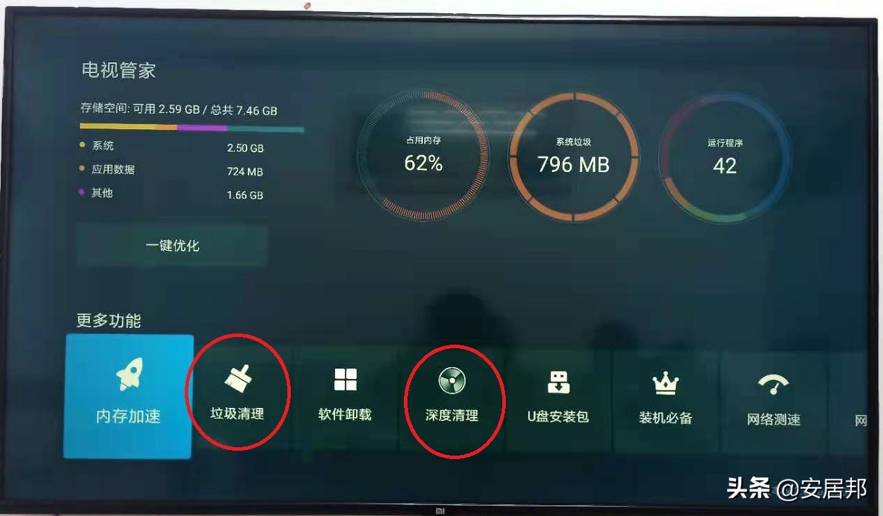 打开X米电视-打开软件电视管家-垃圾清理-深度清理-重新开机