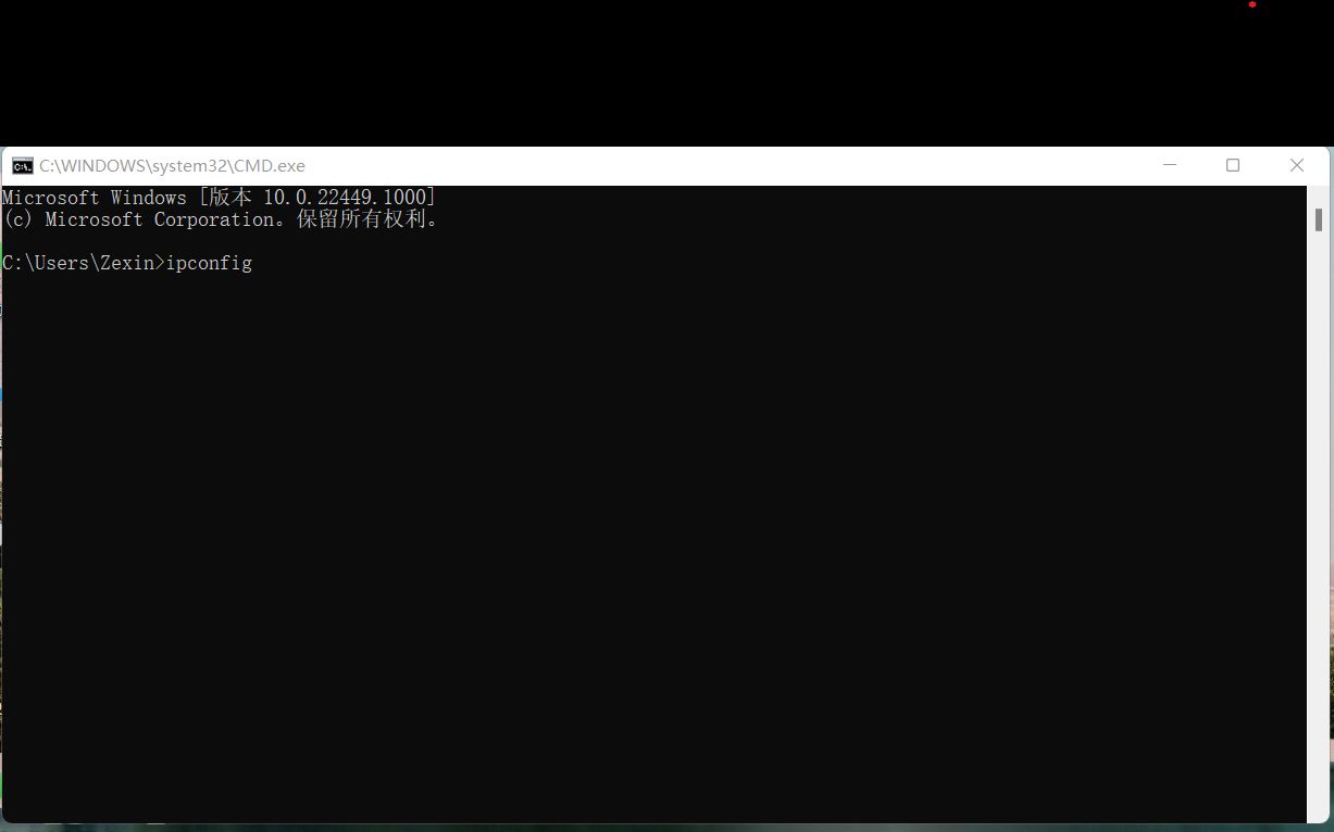 3、在命令窗口输入“ipconfig”,大小写都可以,