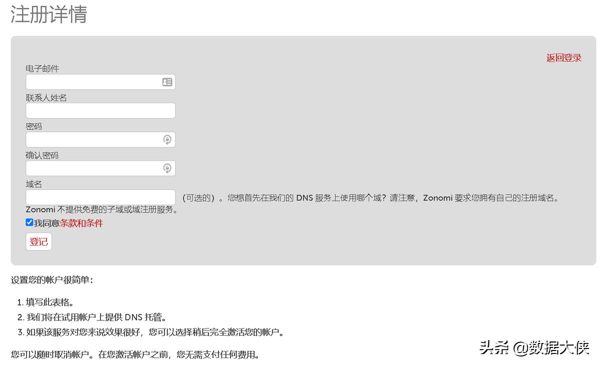 3、需要在快速DNS域名提供商zonomi的网站注册用户。