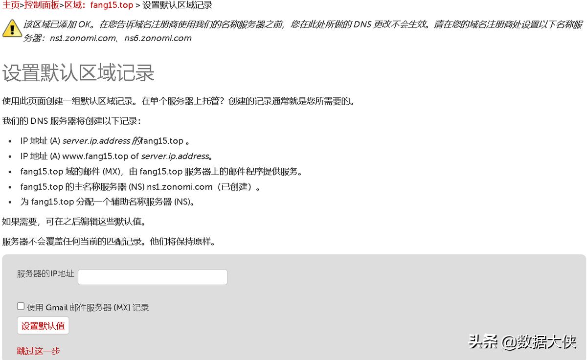 依据zonomi网站的说明配置DNS服务器,如下图所示: