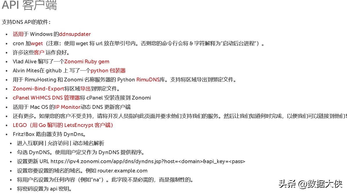 3、在家用电脑或服务器上安装DDNS 更新程序客户端软件,比如支持windows系统的ddnsupdater软件,下载地址:https://ddnsupdater.videocoding.org/download.html,比如支持Linux系统的客户端软件cron 加wget(注意:使用 wget 将 url 放在单引号内。否则您的命令行会将 & 字符解释为“启动后台进程”),其它软件如下图所示: