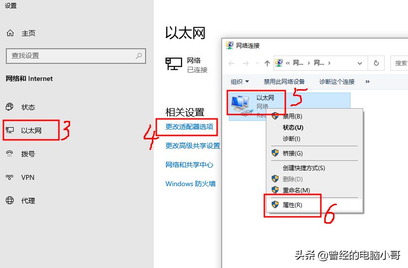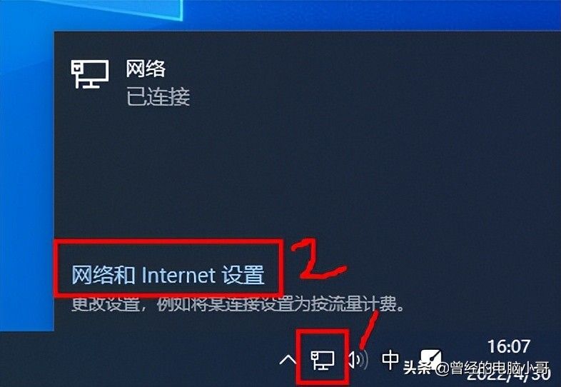 方法二:桌面右下角找到网络小电脑图标→在小电脑图标上点鼠标左键→点上边的网络和internet设置→以太网→更改适配器设置→以太网→右键鼠标点属性→双击IPv4或者IPv6即可查询IP地址。