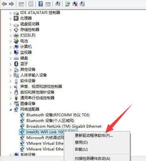 2,单击网络适配器,在网络适配器下拉列表中找到带有WIFI或是WALN的一项,在上面右键》属性》更新驱动。