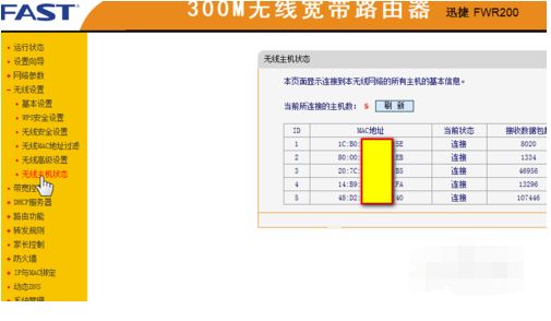 4、点击无线主机状态,可以看到目前正在连接上路由器的设备。