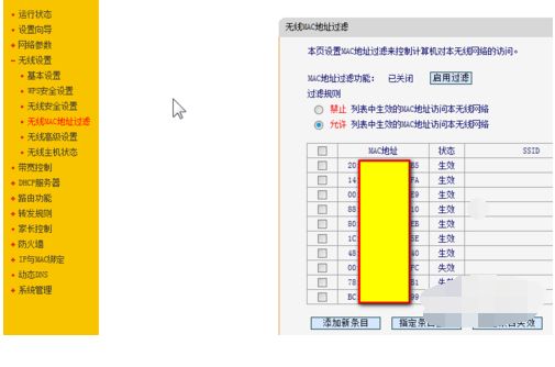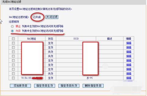 9、设置好之后如下图所示。现在设置好了,只有列表中生效的MAC地址才可以链接上路由器上网。