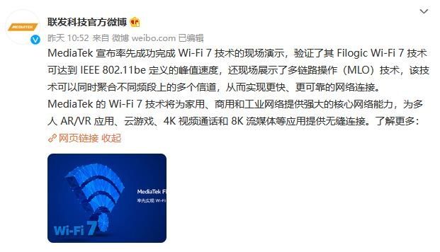 据悉,此次联发科技验证了其Filogic Wi-Fi 7技术可达到IEEE 802.11be定义的峰值速度。同时,MediaTek还展示了多链路操作(MLO)技术,该技术可以同时聚合不同频段上的多个信道,即使频段受干扰或出现拥塞,数据仍可无缝传输,从而实现更快、更可靠的网络连接,这对于需要恒定、持续和实时吞吐量的视频流和游戏等应用至关重要。