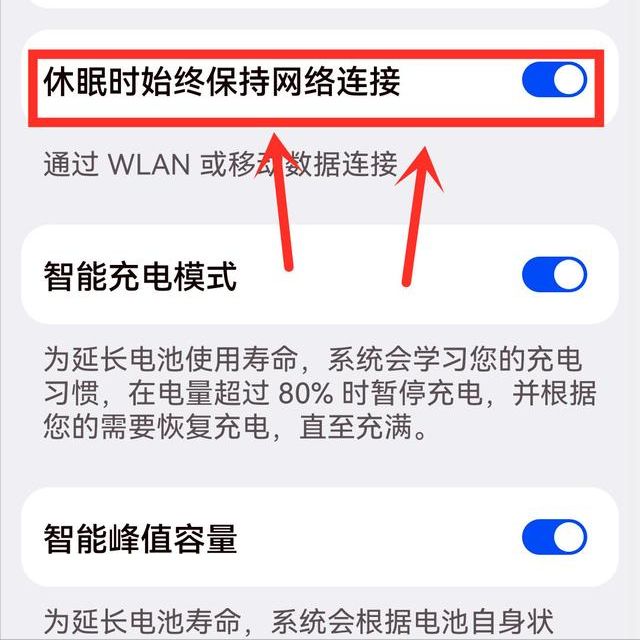 在弹出页面选择休眠时始终保持网络连接,将它设置成打开状态,开启后就可以解决网络延时的问题了!这样,我们到了新的环境,手机立马就会连上新的WiFi,不再会收到“手机wifi已连接(不可上网)”的提示了。