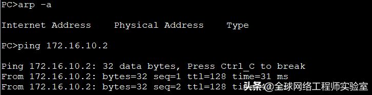 接下来我们PC1pingPC2,也就是让PC1和PC2进行互通