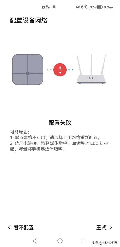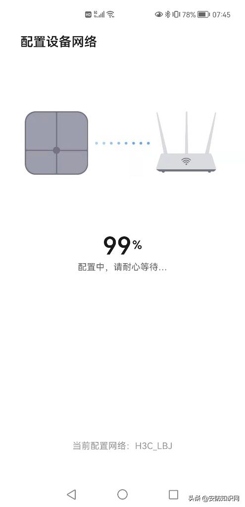 最近在使用华为智能体脂秤3Pro时,发现体脂秤数据经常不能同步到华为手机 “运动健康APP”(手机型号为Mate40Pro)上,开始以为是设备电池电量不足,在更换了新的电池之后,故障依旧。于是在“运动健康APP”上删除了“华为智能体脂秤3Pro”设备,重新添加设备时发现了问题,每次配置设备网络到99%就卡了壳,如图1、图2所示。反复重复了十几次均无法解决问题,包括重新启动了路由器、手机、体脂秤等设备。