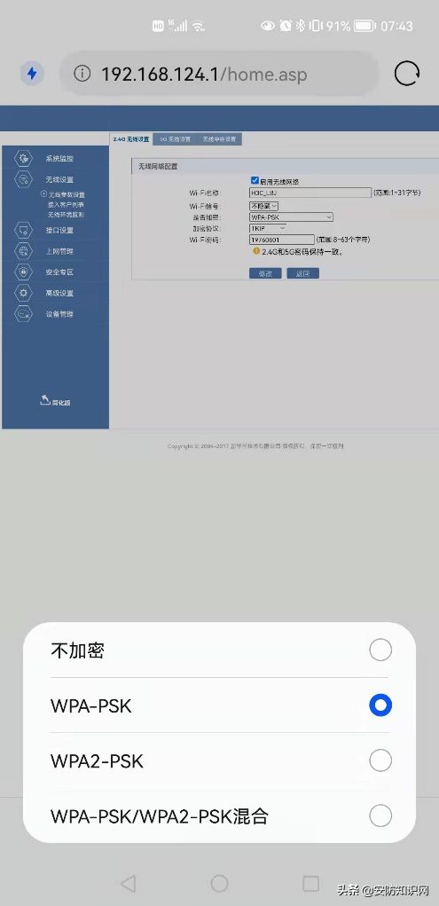 3、WPA-PSK/WPA2-PSK(Wi-Fi Protected Access-Pre Shared Key):其实是WPA/WPA2的一种简化版别,PSK(Pre Shared Key)预共用密钥模式,也称为个人模式,是设计给负担不起 802.1X 验证服务器的成本和复杂度的家庭和小型公司网络使用的。它是我们现在家庭网络用户经常设置的加密类型,不过需要注意的是它有TKIP和AES两种加密协议。