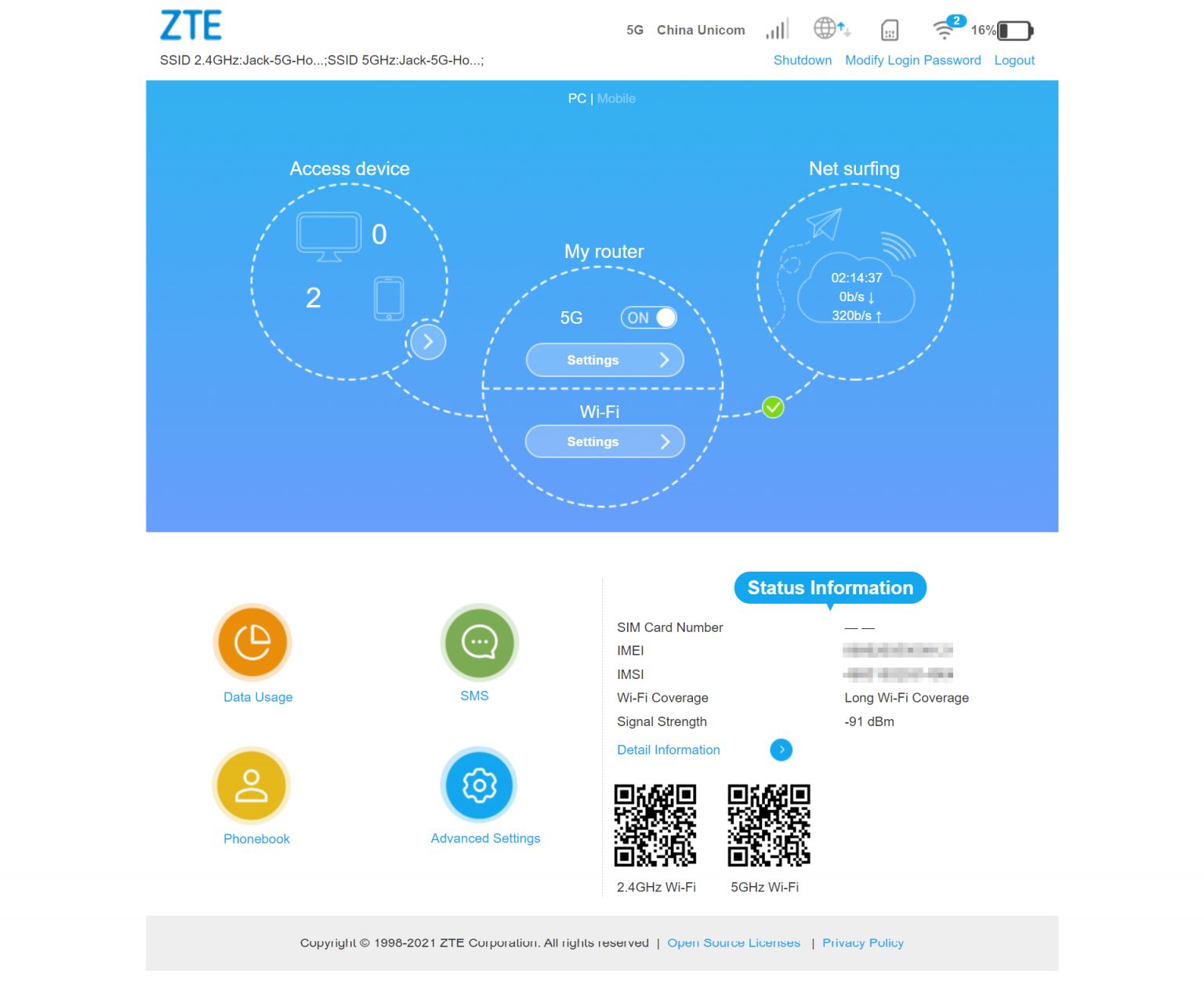 下面是ZTE MU5001的主界面,右边是当前的接入设备,中间是5G开关/设置按钮,和WiFi设置按钮,右边是当前已经使用时长和当前上下行速率,左下方是Data Usage(数据用量)、SMS(短信)、Phonebook(电话簿)、Advance Seetings(高级设置)这四个按钮,右边则会显示SIM卡状态信息,你可以查看SIM卡号码、IMEI、IMSI、WiFi模式、手机信号等信息,如果你想查看更多信息,还可以点击Detail Information。