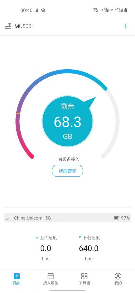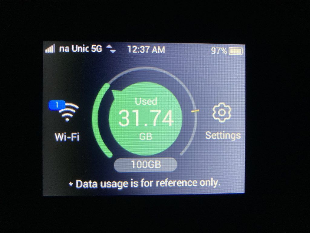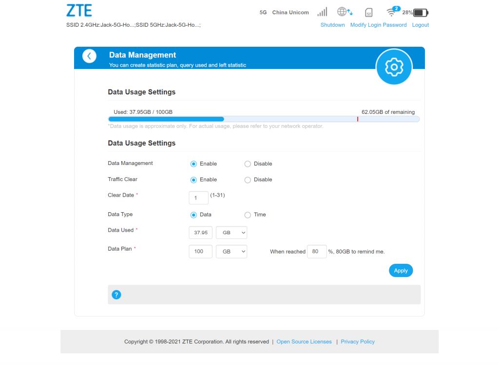 Data Usage(数据用量 )界面中,你可以查看当前MU5001已使用多少流量,每月几号重置流量等流量信息,你还可以手动校准流量值和设置套餐流量。