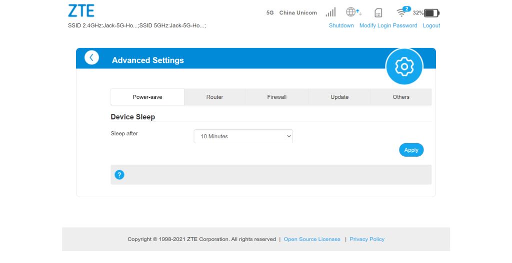 最后是Advance Seetings(高级设置)界面,在这个界面,你可以对设备进行各种操作,包括休眠时间,DHCP功能,UPNP功能,DMZ和端口转发等一系列功能调整,你还可以检查MU5001最新固件。