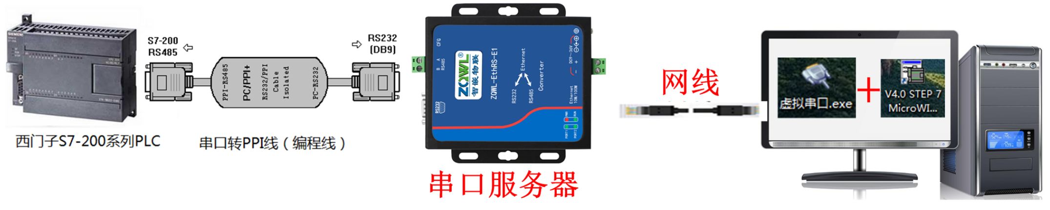 S7-200 PLC连接PPI编程线缆,PPI编程线缆的RS232端连接串口服务器的RS232口,串口服务器网口连接电脑网口或者路由器网口。
