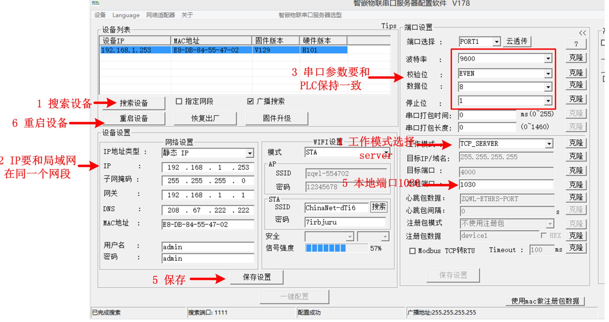 设置串口服务器的IP地址与局域网网段一致,设置串口服务器的波特率为9600,校验数据位停止位:EVEN 8 1。这个参数要和PLC的参数一致。
