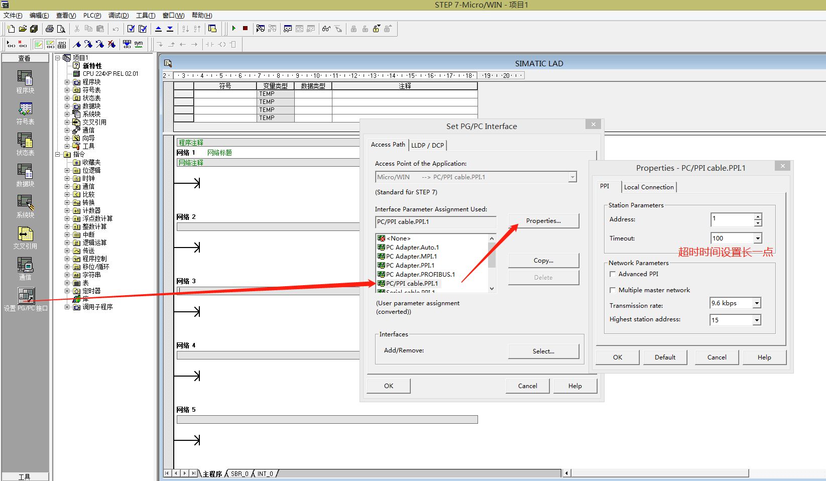 点击设置PG/PC接口,选择PC/PPI,点击属性,将超时时间设置大点,设置10或者100。