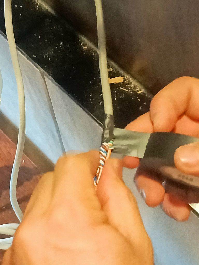 将网线从组件上取下来,把新旧网线连接起来,打结弄好以后用胶布裹上。实现同时进出的作用。
