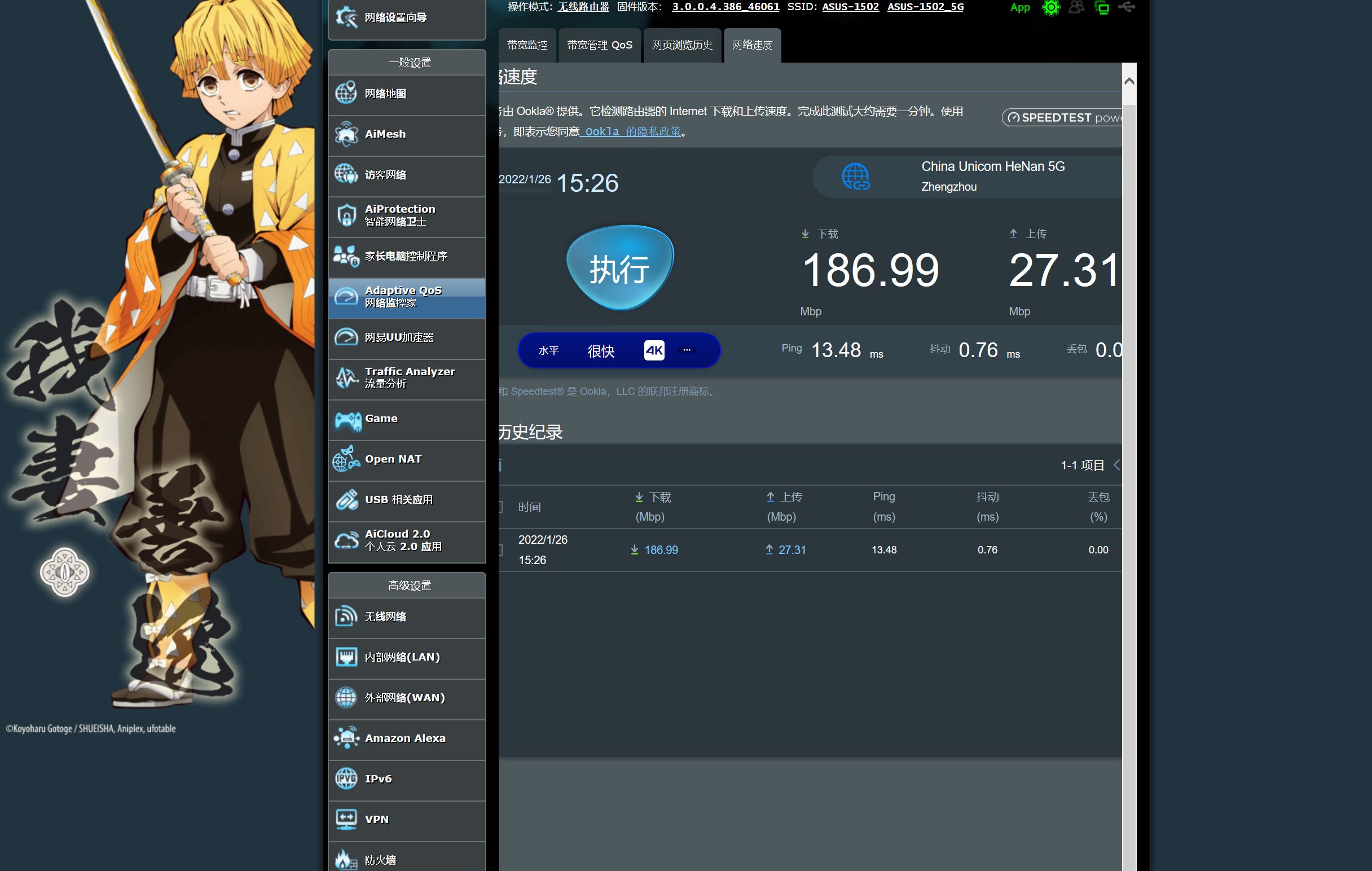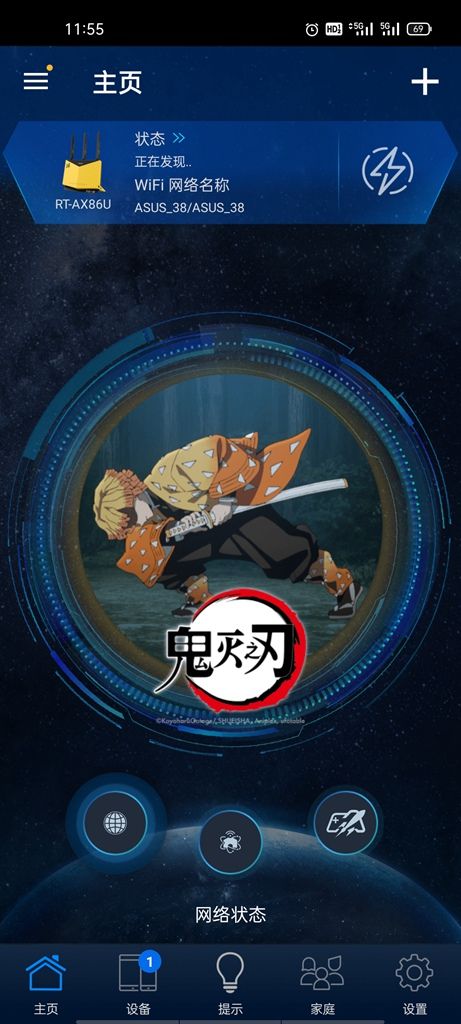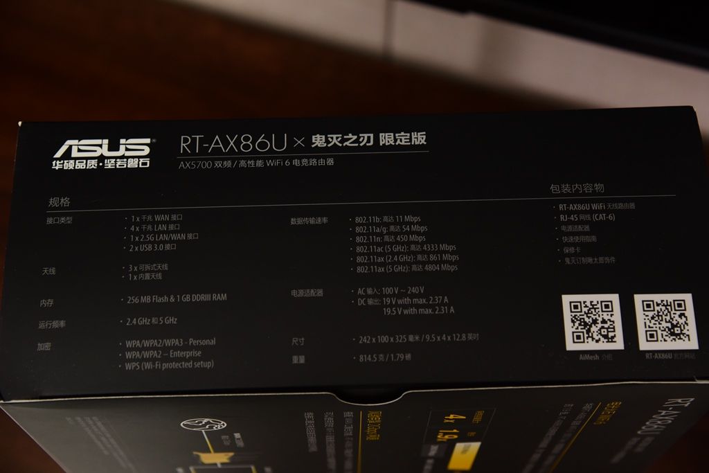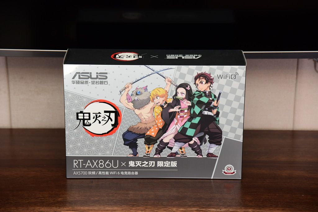 本着花一次钱少折腾的想法,最终圈定了华硕的AX86U、AX88U、AX6000三款路由器。AX88U是华硕的经典造型,AX6000的造型又略显张扬,放在客厅会感觉不舒服。最终选定了AX86U,竖直摆放,还可以节省电视柜的空间。正好这一段时间,华硕推出了AX86U的鬼灭之刃限定版,非常有二次元风格。于是痛快入手。