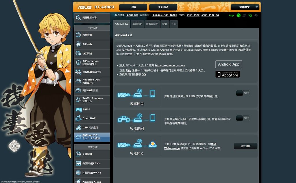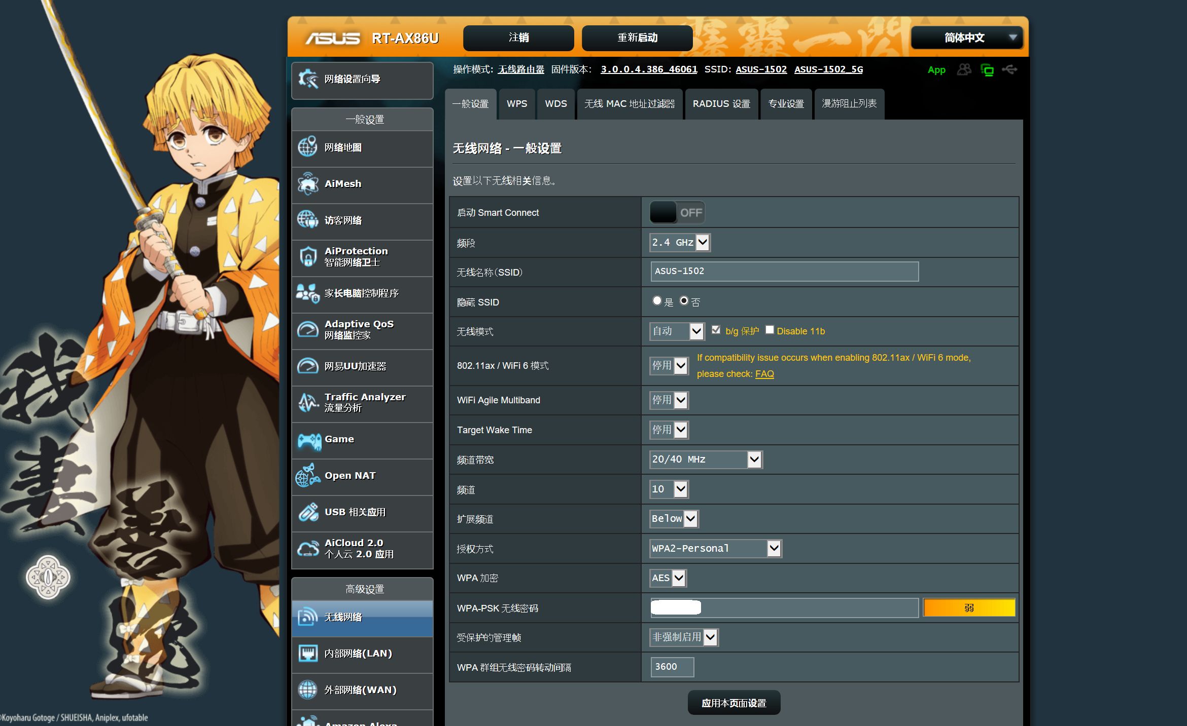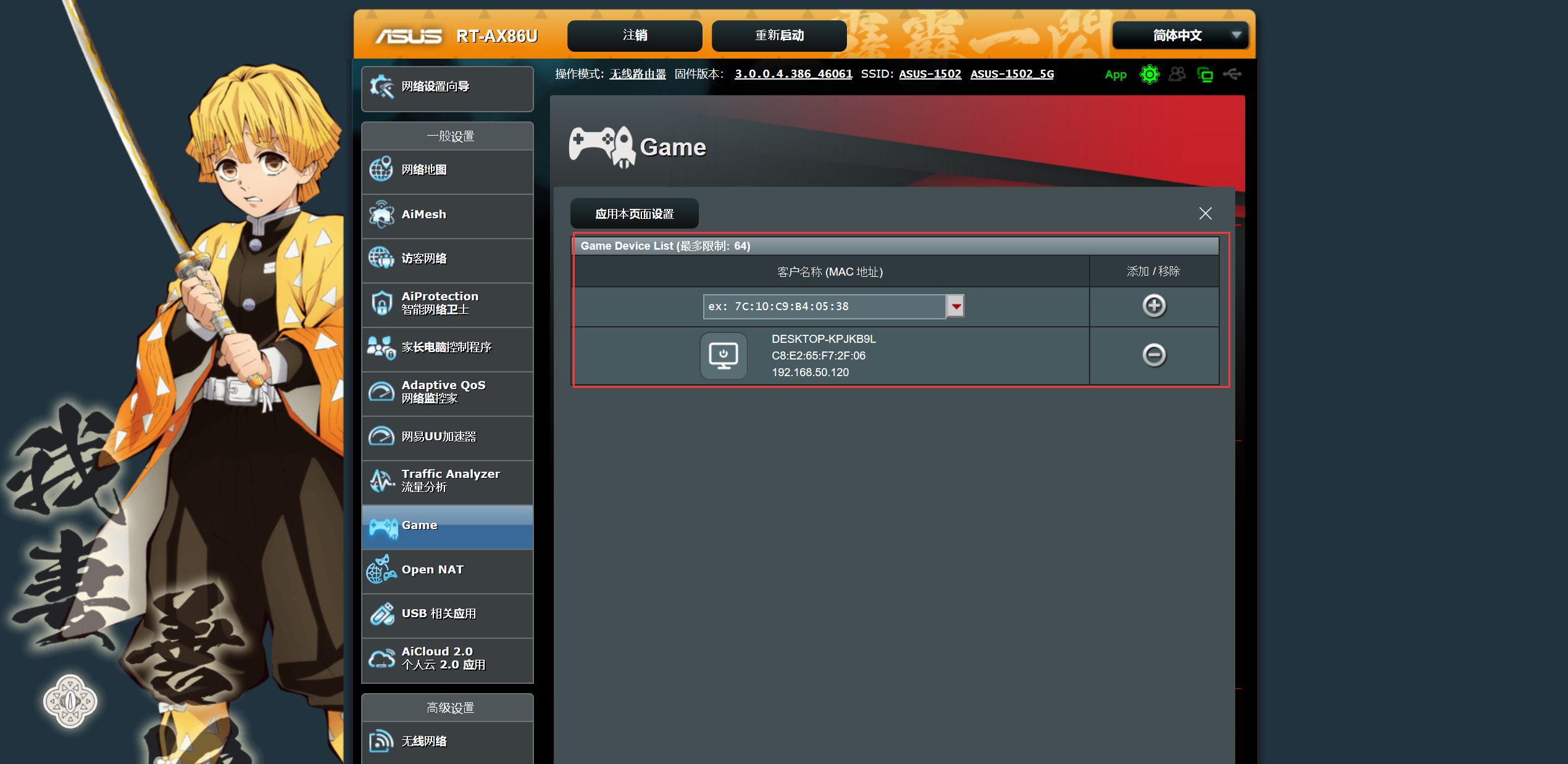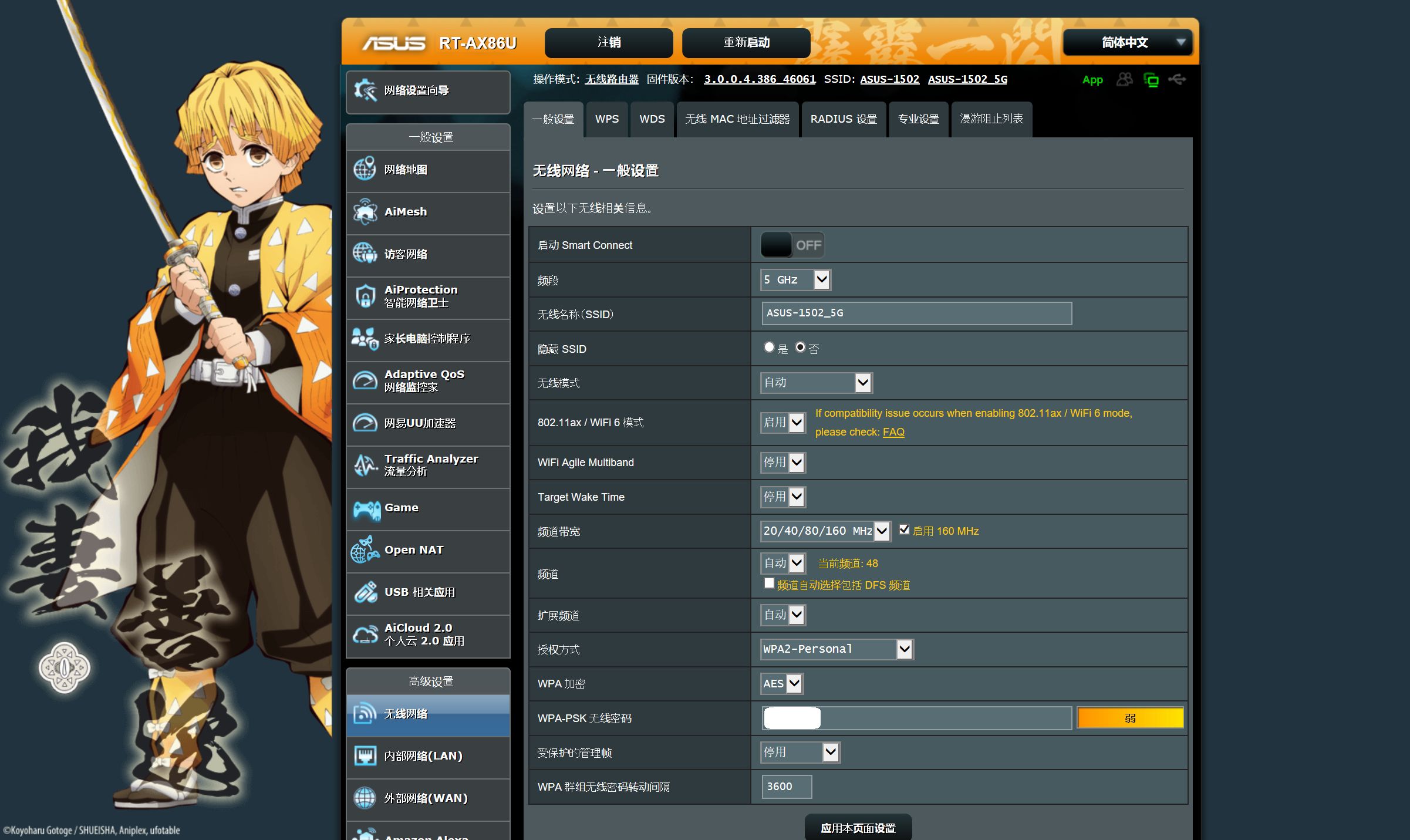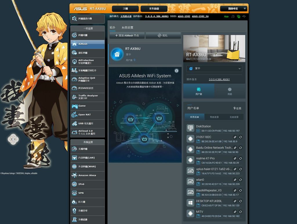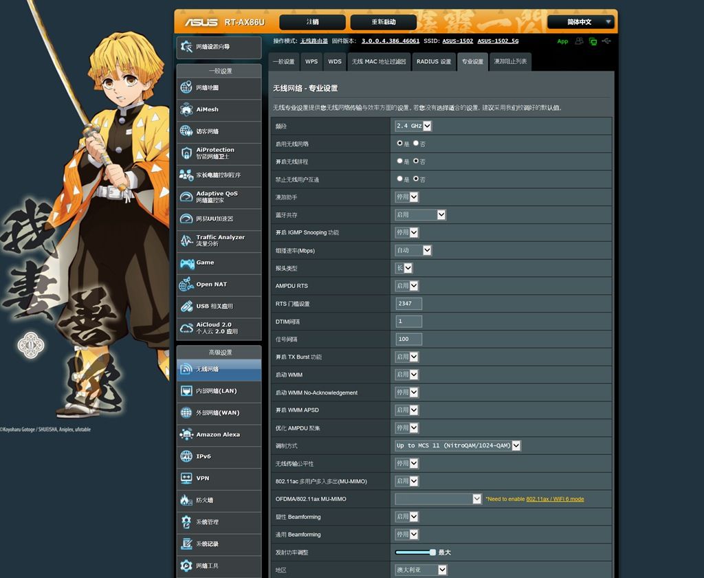 华硕AX86U鬼灭之刃限定版,整个路由的风格是偏向卡通的亮黄色,非常可爱。AX86U的CPU为4核心的博通BCM4908,每颗频率为1.8GHz,拥有1GB RAM和256MB ROM。