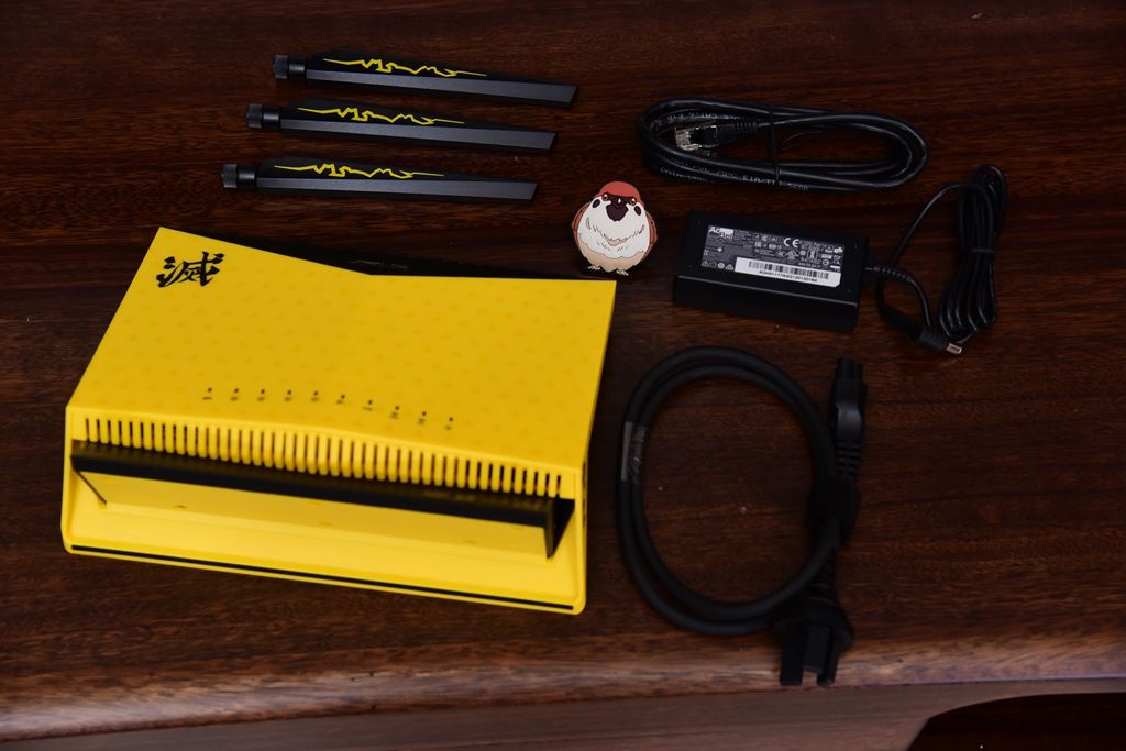 所有产品有:路由器、3支可拆卸式高增益天线、麻雀挂件1个,1台电源和1条超六类网线。