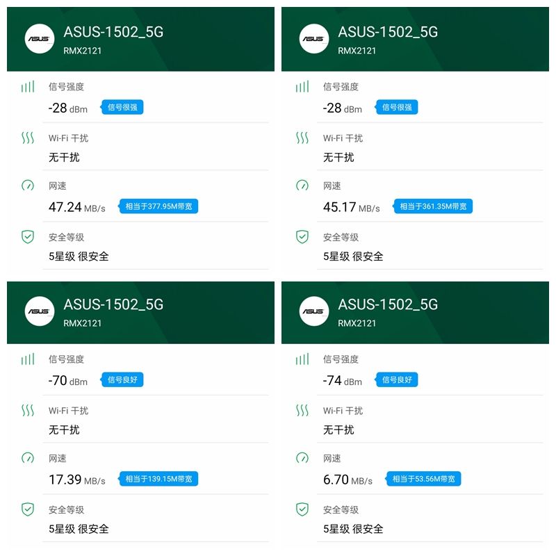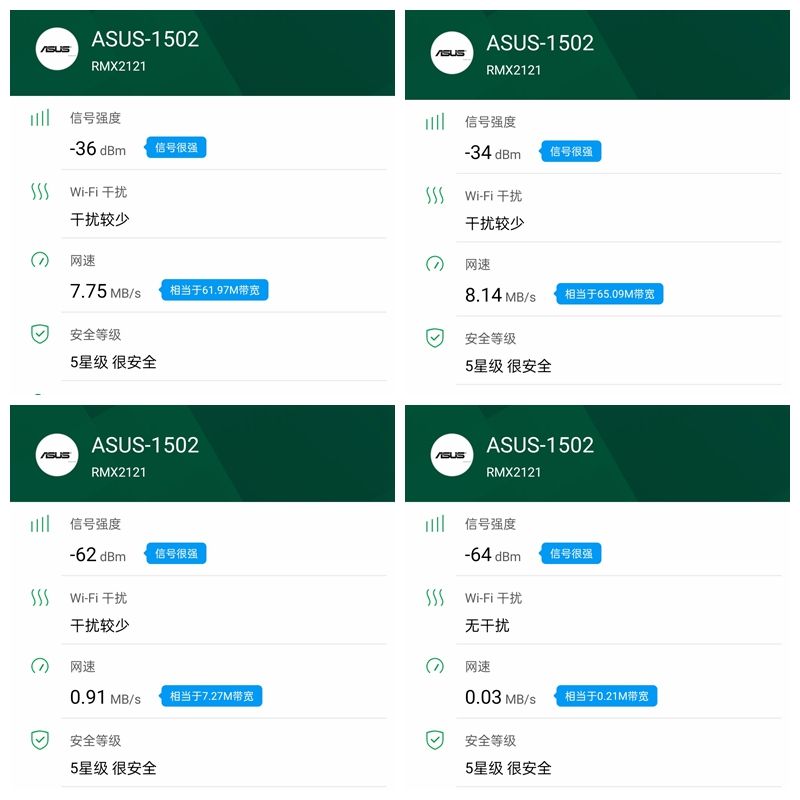 AX86U单路由覆盖的情况下,由于5G频率高,穿墙性能更差一点,信号强度不及2.4G。但是在F点(主卫生间)信号虽弱,但速度依然不错,其它位置的速度更是可以得到保障。