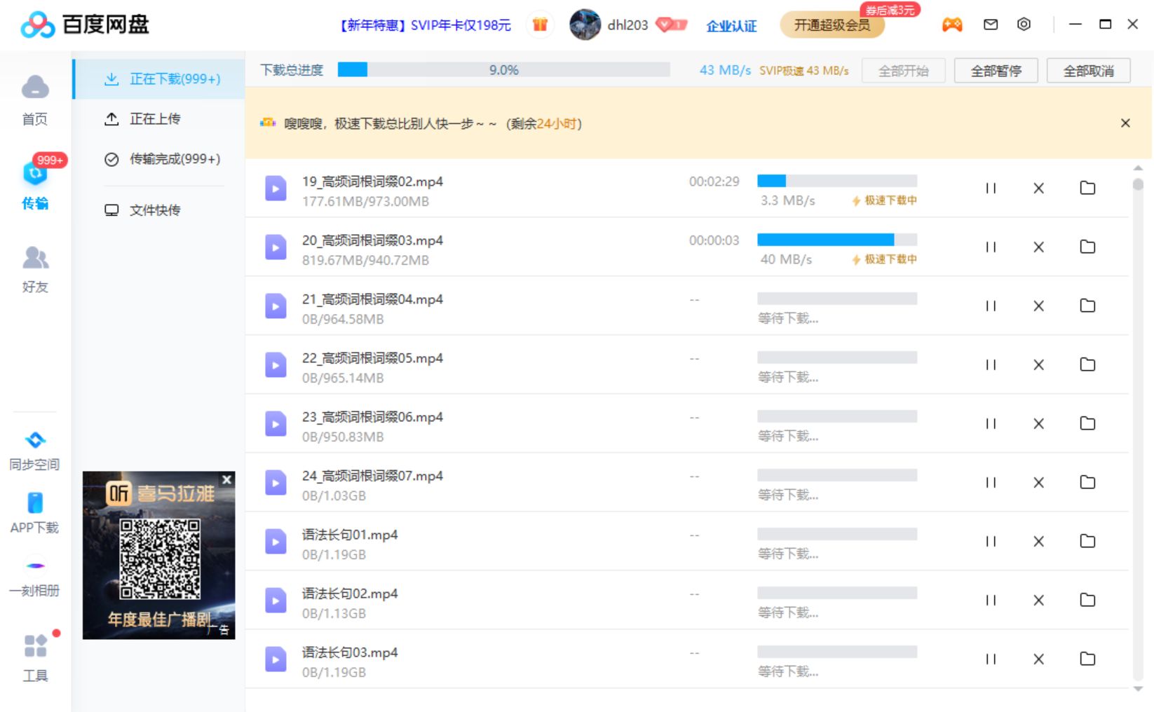 使用本人主力电脑,通过WIFI连接路由器,使用百度网盘PC端下载学习资料,速度一直保持在45MB/S左右,给力。