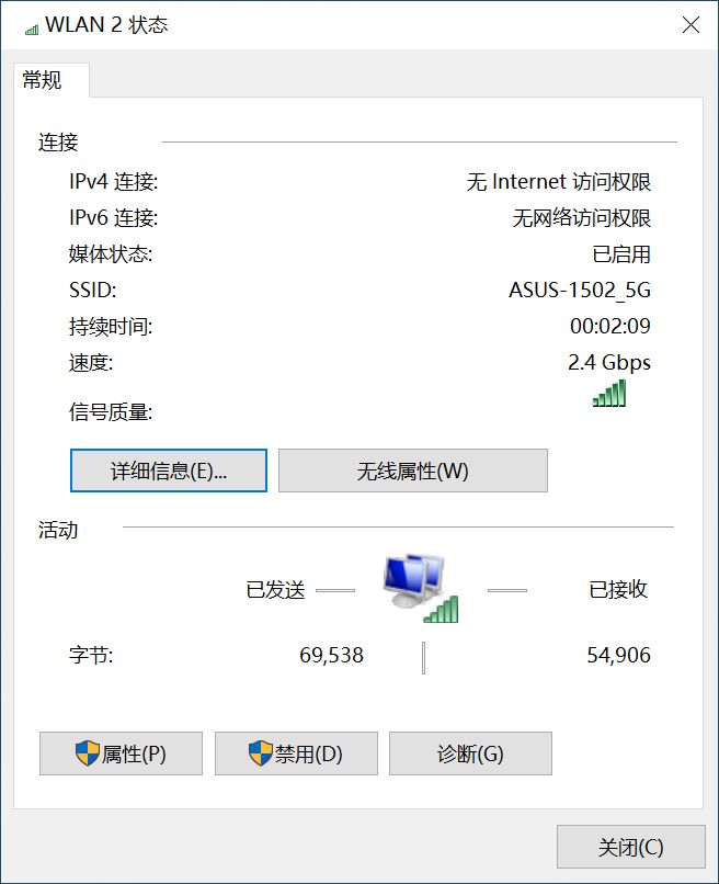 通过查看网络连接属性,此时无线网络连接速度降为1.2G,基本跑满80%带宽,正常表现范围之内。