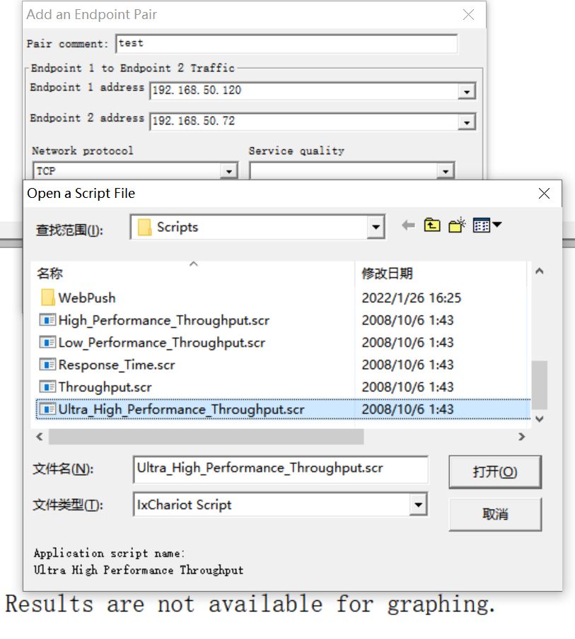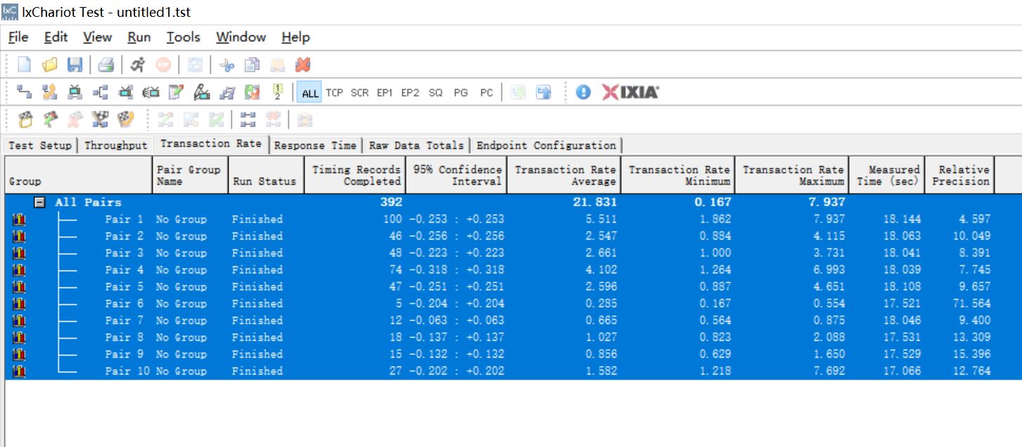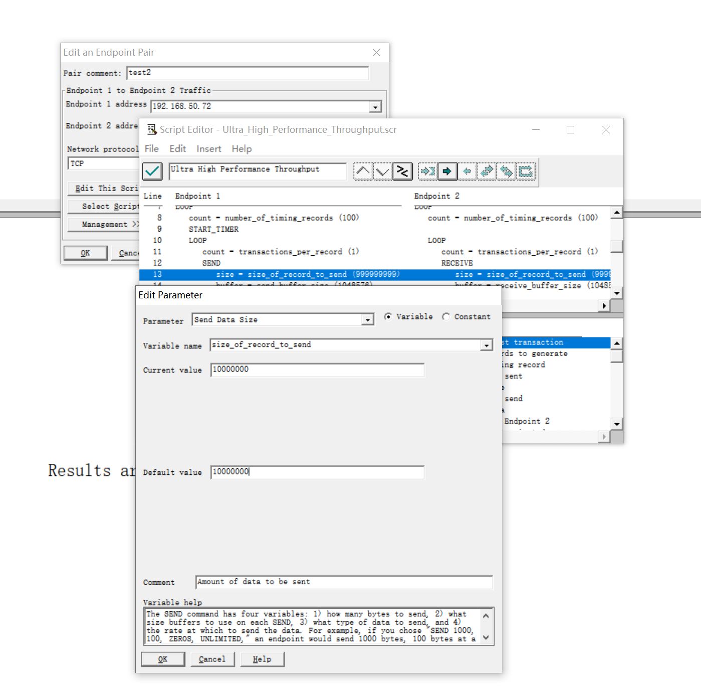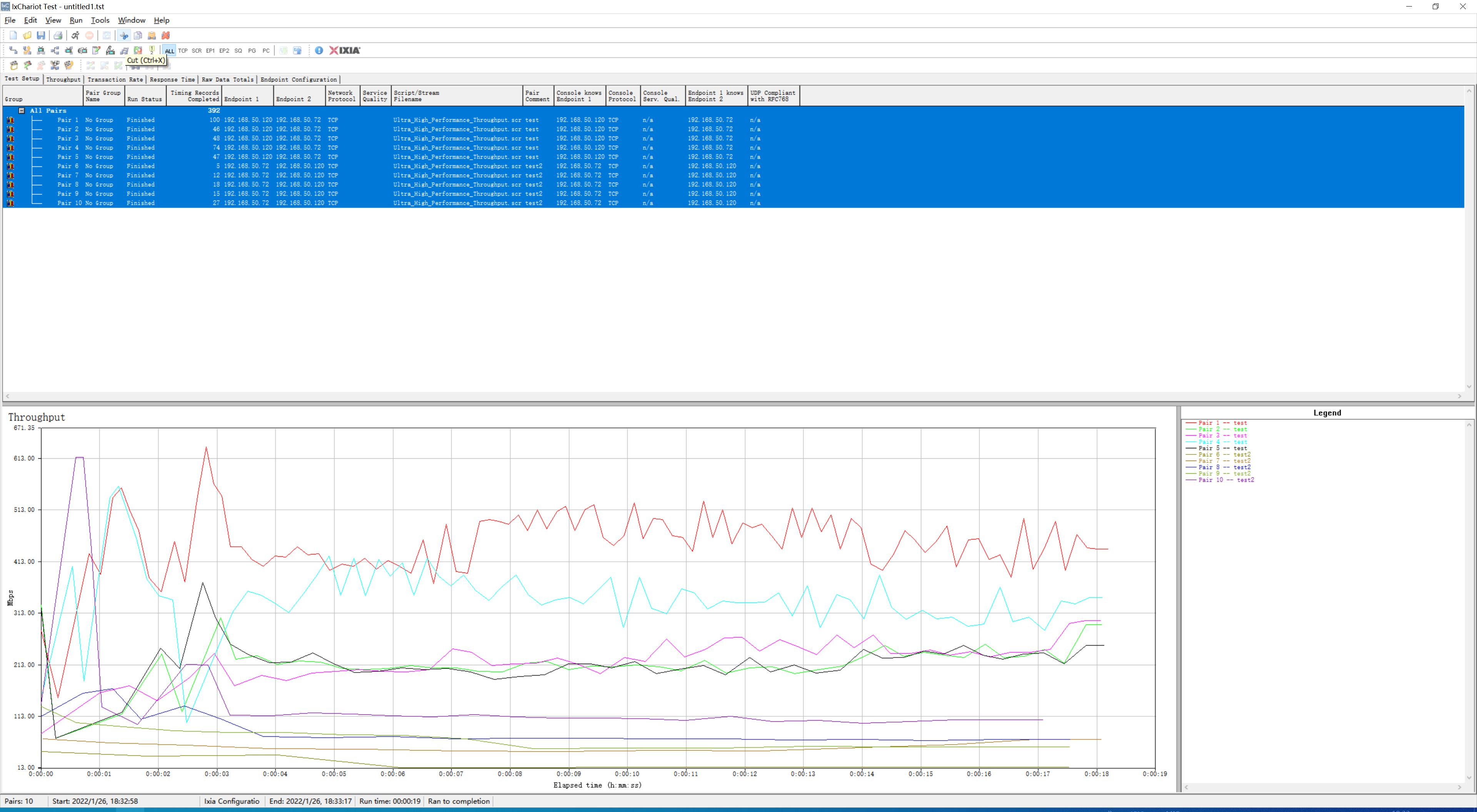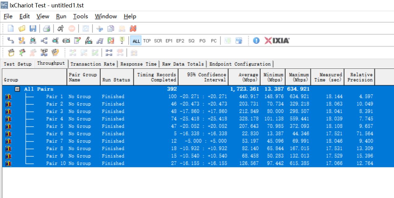 打开IXCHARIONT控制台,新建测试样本,选择脚本类型为ULTRA HIGH PERFORMANCE THROUGHPUT,然后根据需求编辑测试脚本容量,将其设定为10MB,打流结果如下: