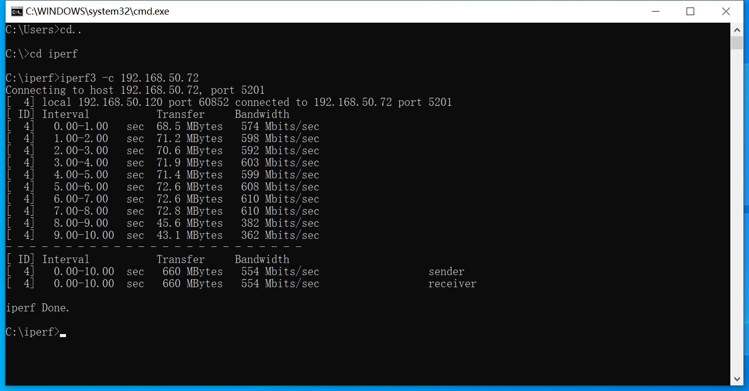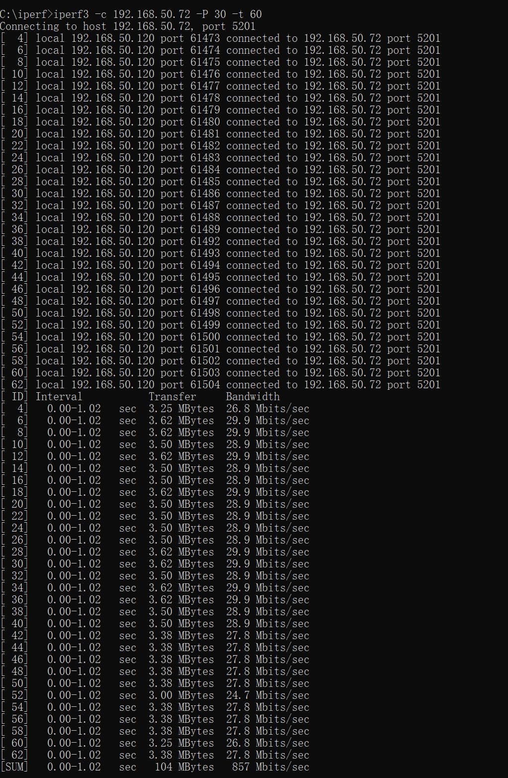 保持上述连接,使用PC主机2作为客户端,PC主机1作为服务器端,通过IPERF3,进行打流测试。