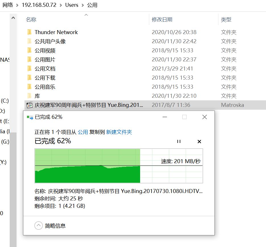 将两台电脑保持上述连接,PC主机1共享视频资料,PC主机2复印此资料到本地固态硬盘,速度为200MB/S,基本上实现了1700Mbps带宽的完全使用。符合预期,我比较满意。