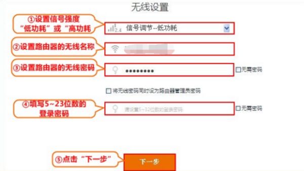 7、然后选择无线信号强度、设置路由器的无线信号名称及密码、并设置路由器界面的登录密码,点击“下一步”。