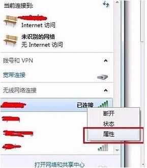 选中需要查看的无线网络连接,右键点击,在选择菜单里,选择“属性”: