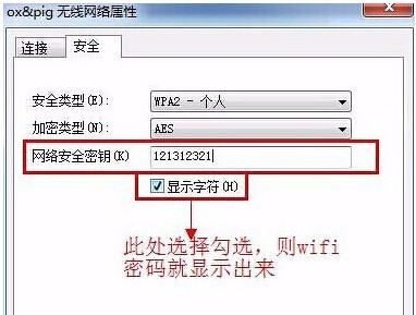 在属性窗口中,选择“安全”选项卡,然后把“显示字符”选项前面的勾打上,则此时网络密匙就能完全展示出来。