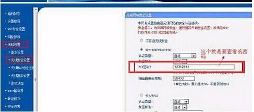 在左侧的菜单栏,选择“无线设置”下的“无线安全设置”,点击后,右侧会出现路由器的相关的加密方式,选择加密的形式,可以查看无线密码: