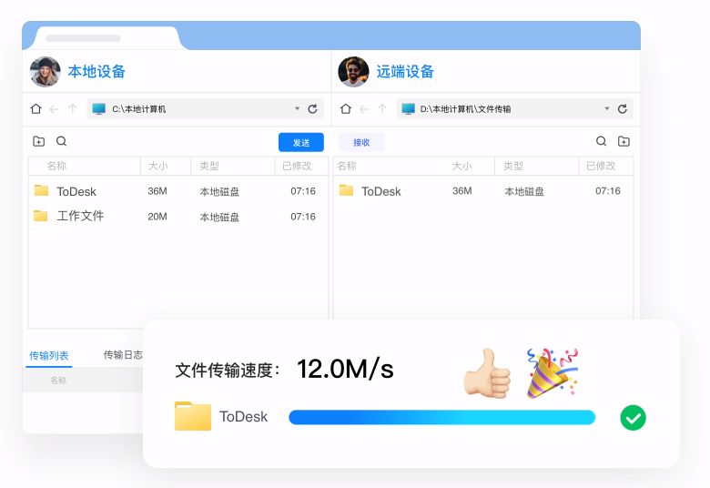 ToDesk远程传输文件的途径有两种,例如在隔离期间,如若突然遇上上司要求发送公司文件,家里只有手机设备,可直接远控办公室电脑,将文件拖到自己家里的电脑桌面上,实现文件拷贝和传输就好了。对比网盘或者邮件的传输的形式,可以说是非常便捷了。