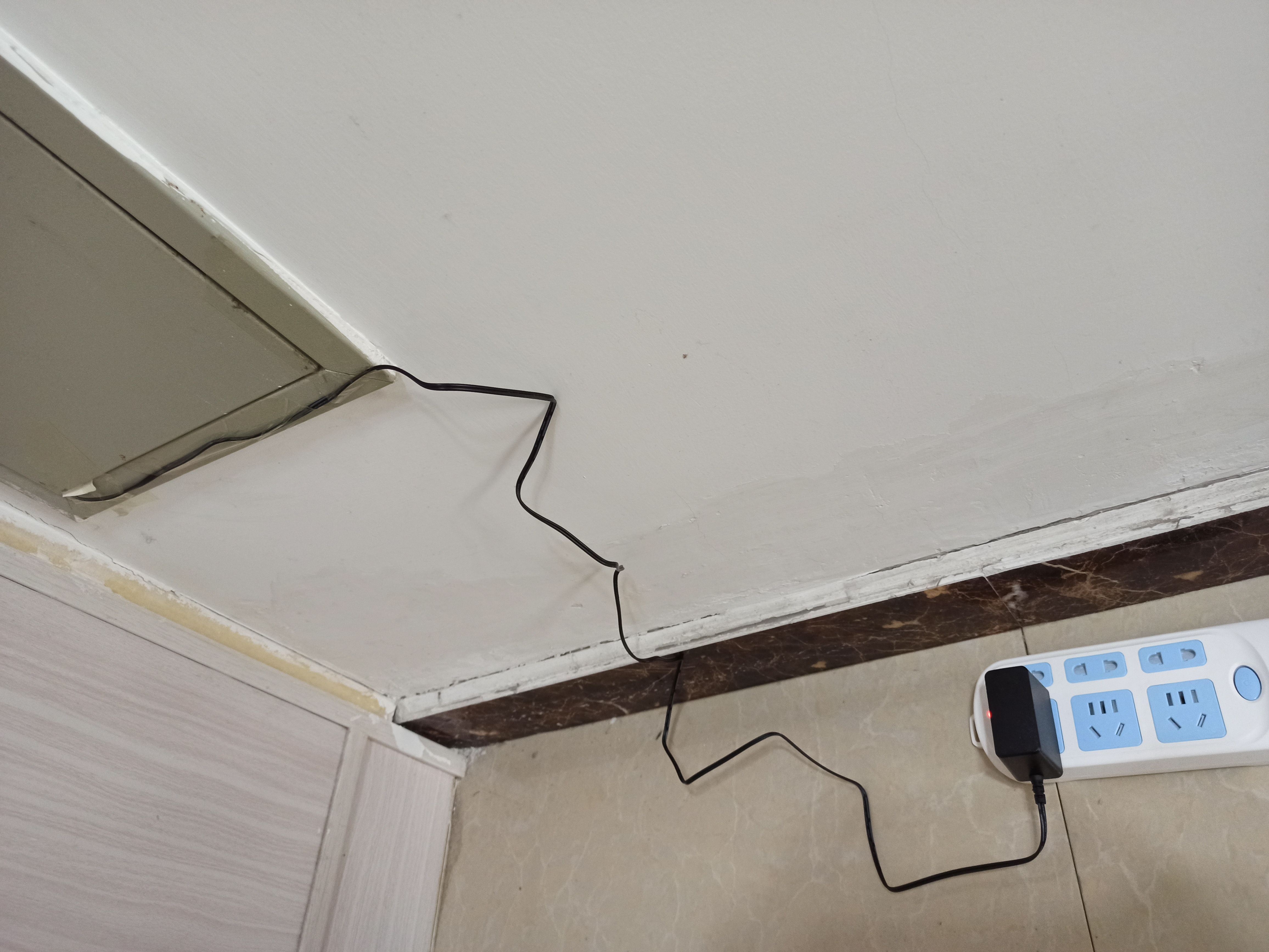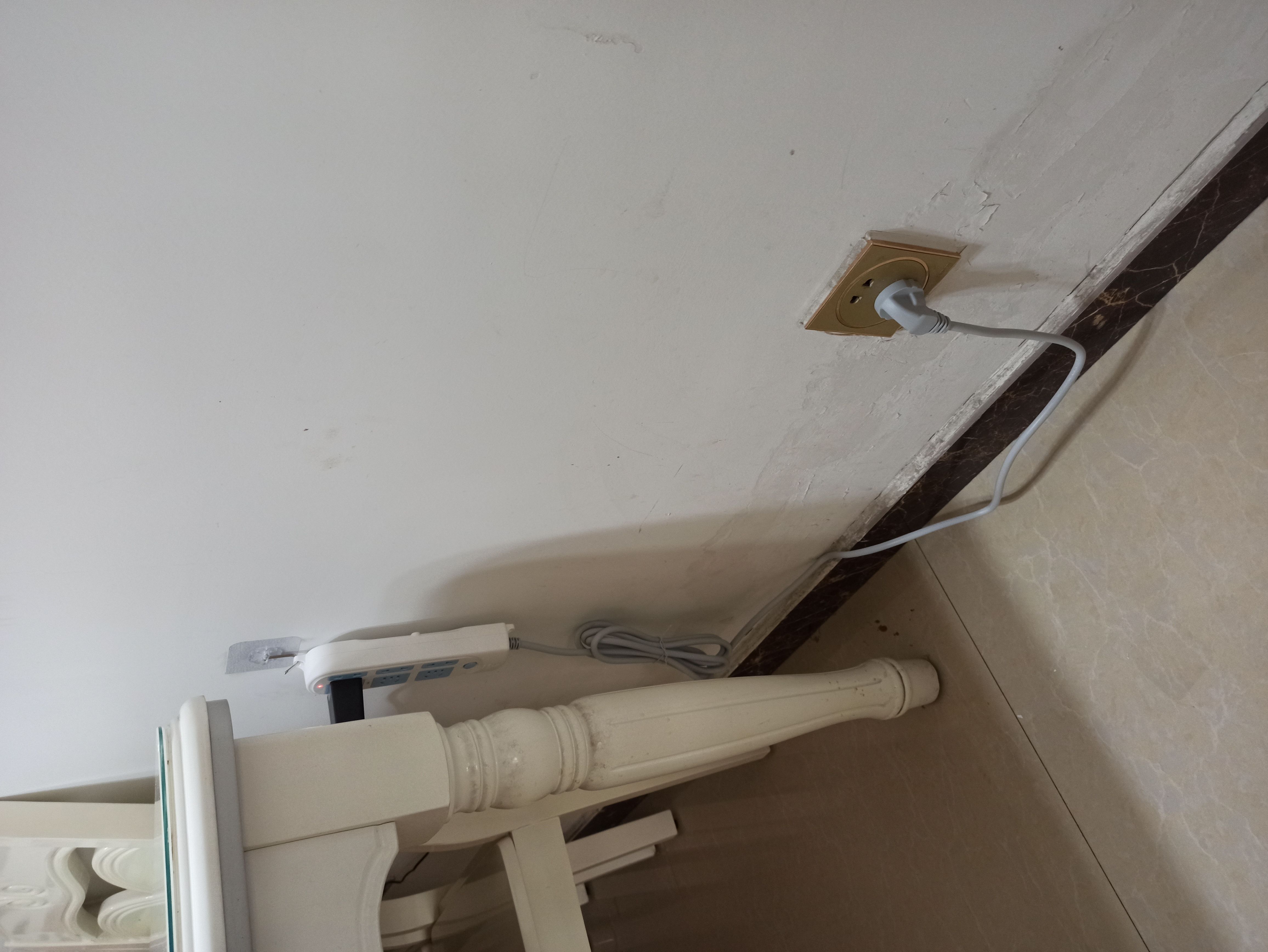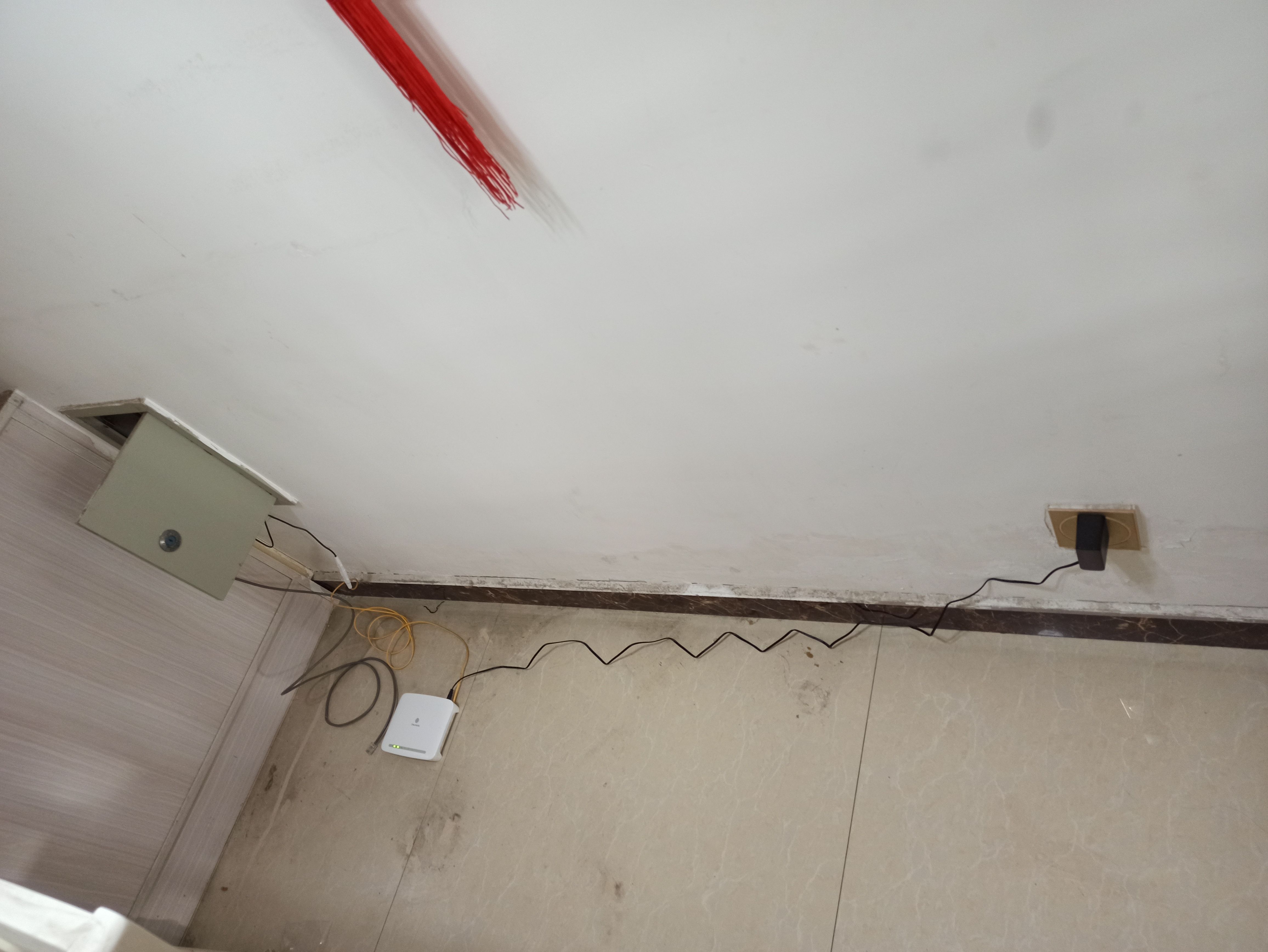 这不尴尬了,这时他一回头看到右边墙上有个插座,二话不说拿出来光猫上带的电源线插上了,然而这个距离正好和电源线等长,这样一弄,光猫就无法正常放进网线盒里,所有的东西都裸露在外,关键是这一个插头直接把我这面墙上唯一的插座给占用了,造成我生活的很多不便。