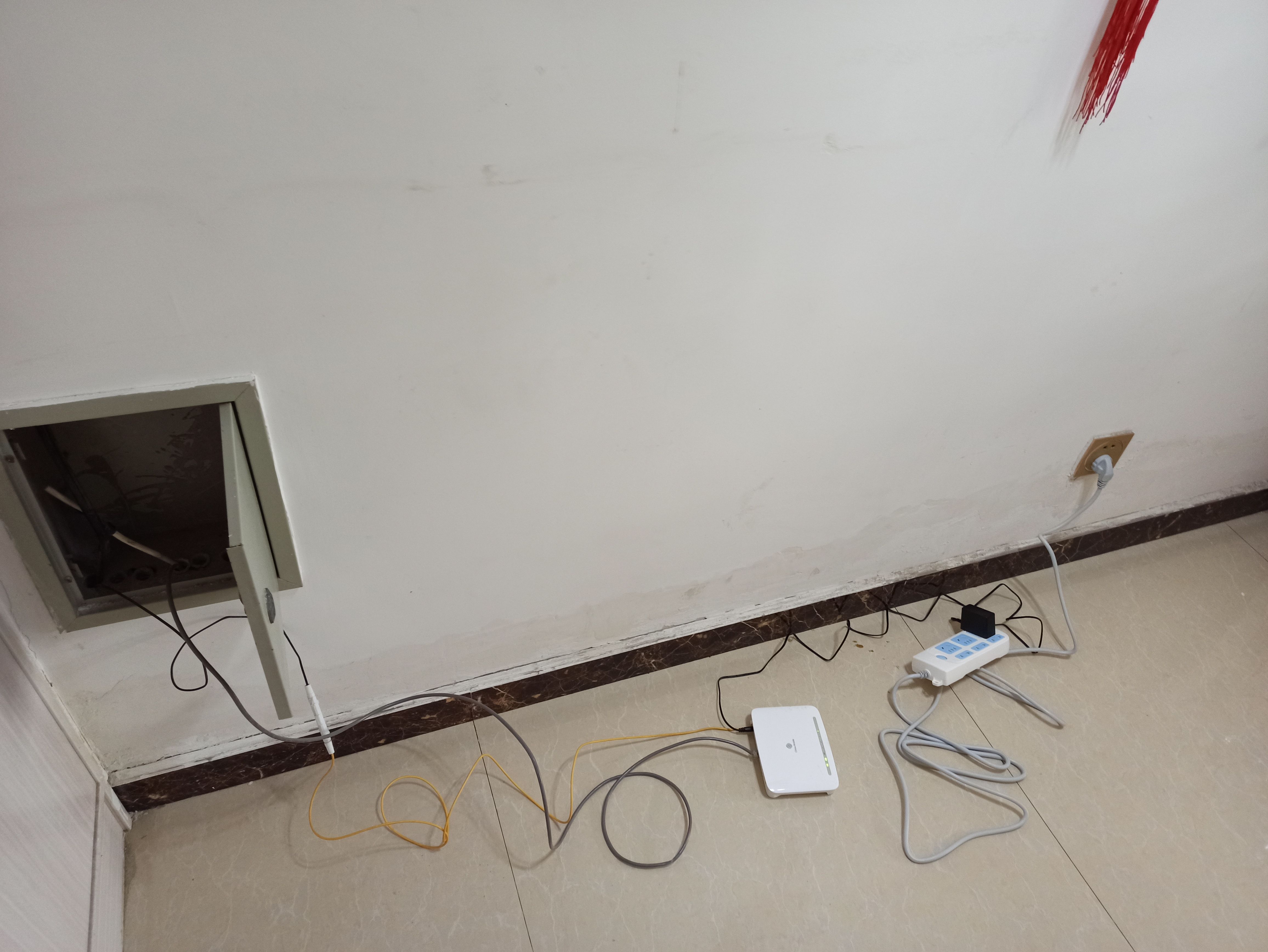 看到这我是无名火涌上心头,我就问他:你怎么不按照原来那种接法,美观还不占用其他资源?(之前施工人员是从我路由器这边引过去的弱电,就是利用网线里面的四根细线代替,很完美。)小伙子犹豫了一下说:那样影响信号传输,连不上。(咱也不知道他说的是真是假,还是为自己的失误找借口。)我说那这样怎么行,弄得太难看了,你如果提前说咱可以想办法引过来暗线,这算啥?小伙子说这样就行,要不就拉直线强行关上!
