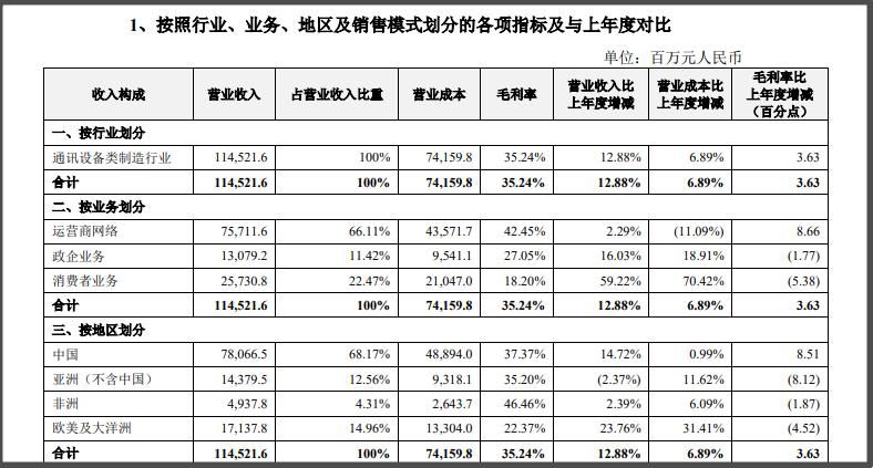 中兴通讯营收构成 图片来源:中兴通讯公告