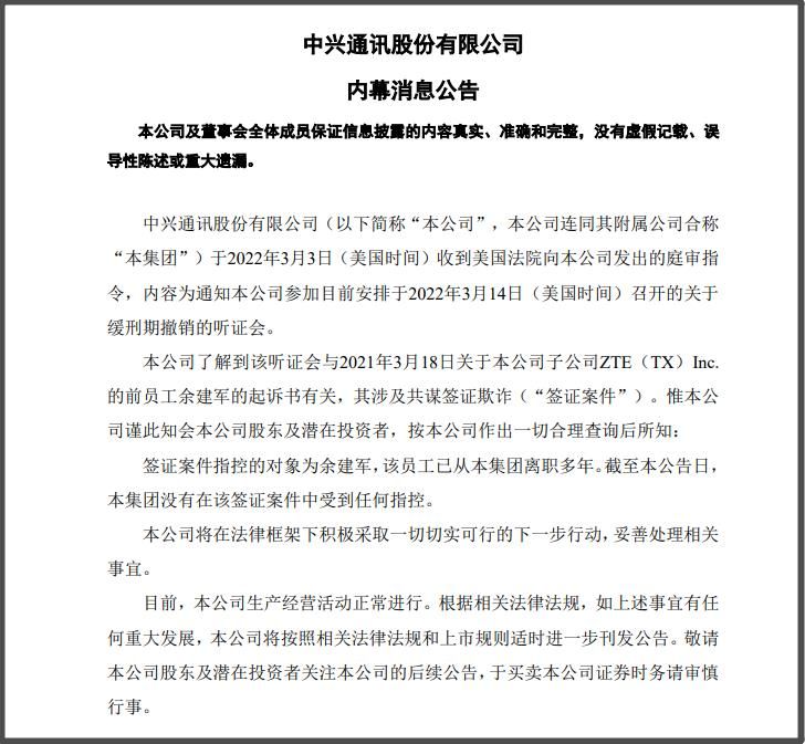 中兴通讯内幕公告 图片来源:中兴通讯公告