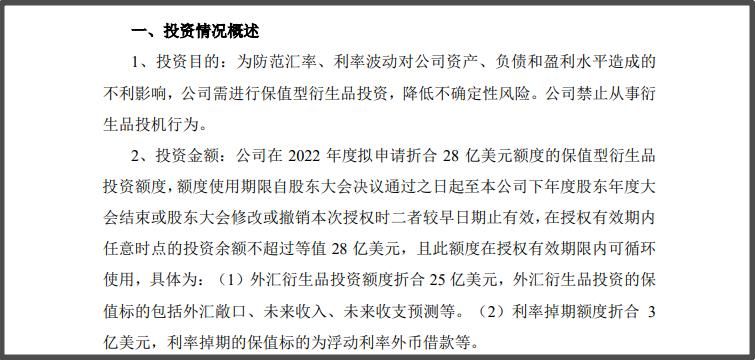 中兴通讯表示,为防范汇率、利率波动对公司资产、负债和盈利水平造成不利影响,公司拟申请折合28亿美元额度的保值性衍生品投资额度,其中25亿美元用于外汇衍生品投资,外汇衍生品投资的保值标的包括外汇敞口、未来收入、未来收支预测等;3亿美元用于利率掉期额度,利率掉期的保值标的为浮动利率外币借款等。