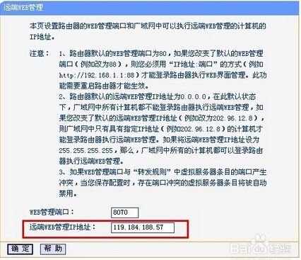 假如路由器的外网ip地址是119.184.188.55,我们就可以使用ip地址为119.184.188.57的电脑访问119.184.188.55:8070就可以登录路由器,假如我们把“远端WEB管理IP地址”设置为255.255.255.255,那么,广域网中所有的计算机都可以登录路由器执行远端WEB管理。