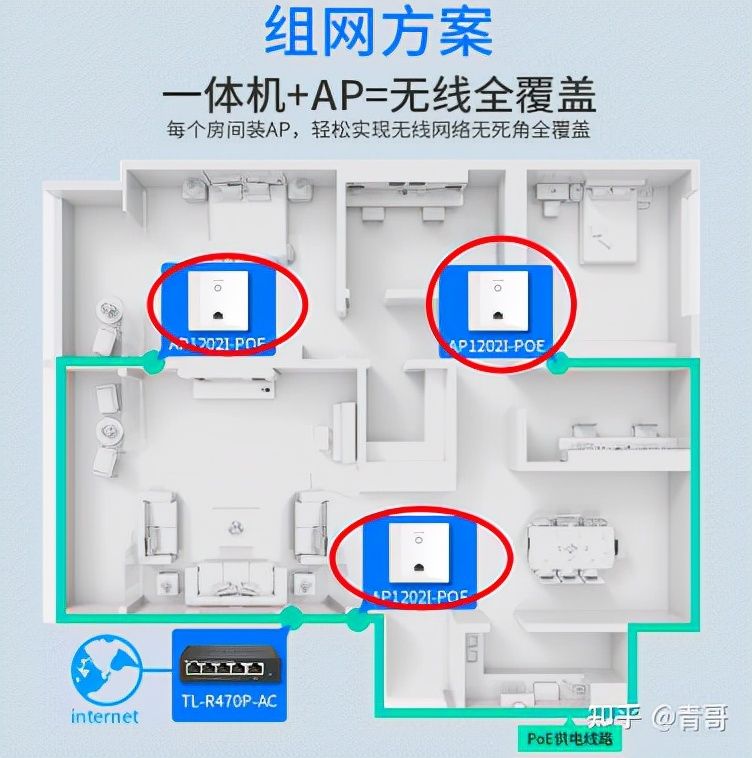 这种方案一般是用在房间楼层比较多的大别墅,或者医院,酒店,学校,公司这类比较大的场所。ac+ap的解决方案一定要提前预留网线。