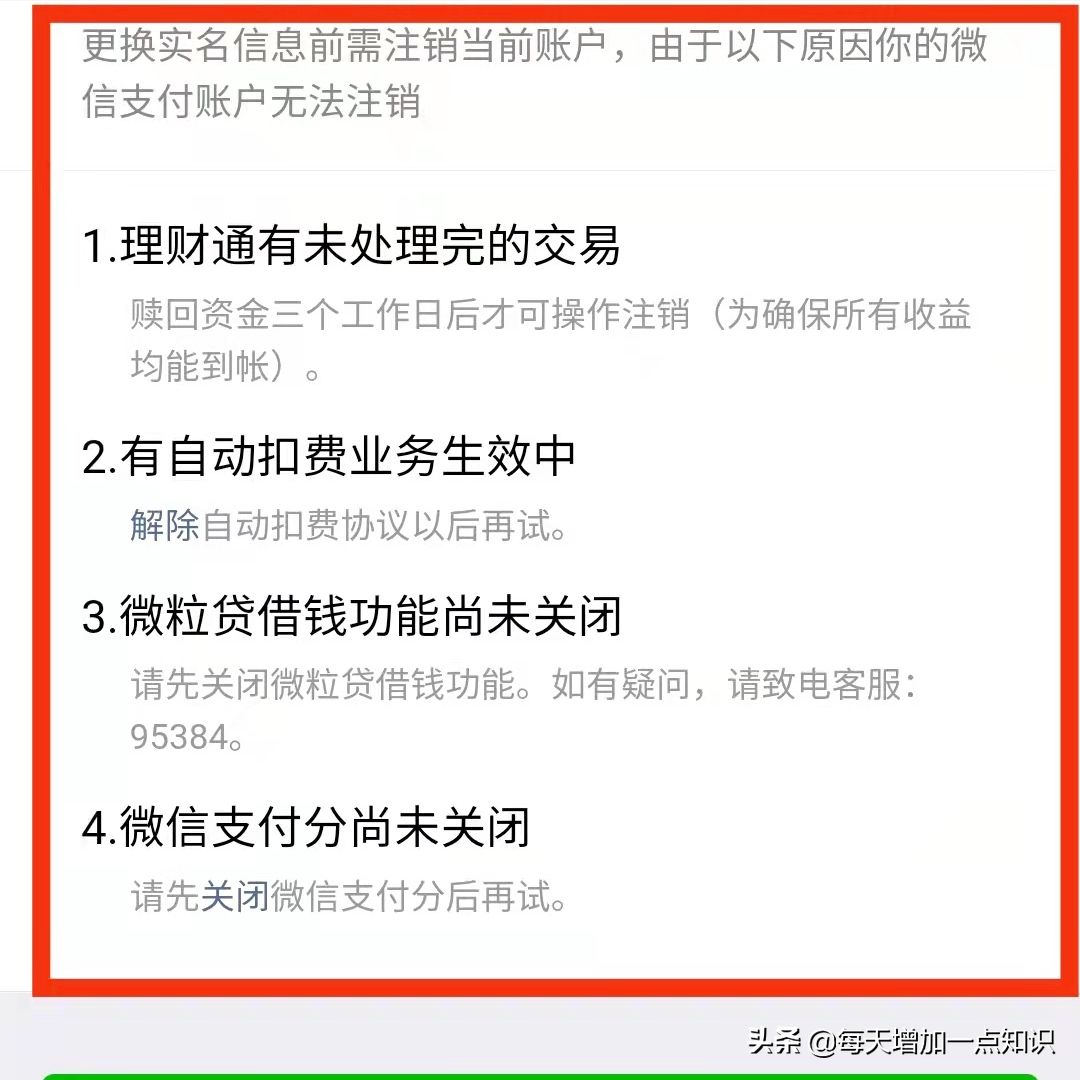 第六步:但是会因为一些前账户未完成的操作,导致不能重新认证账户。比如未处理完成的交易,未解除的自动扣费的业务还有微信支付分尚未关闭等等,每个人的情况不同。我们需要将这些全部完成就可以重新进行的“实名认证”了