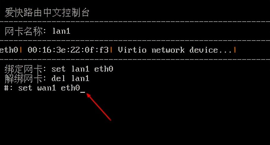 - 删除LAN口将网口重新绑定到WAN口上(因为云服务器只有一个网口,多网口可忽略),输入对应编号“1”如图一;查看对应网卡信息进行解绑lan口,输入解绑网卡的代码,如图二;然后将eth0绑定到WAN1,如图三。修改完成后,输入“q”即可退出到主界面。