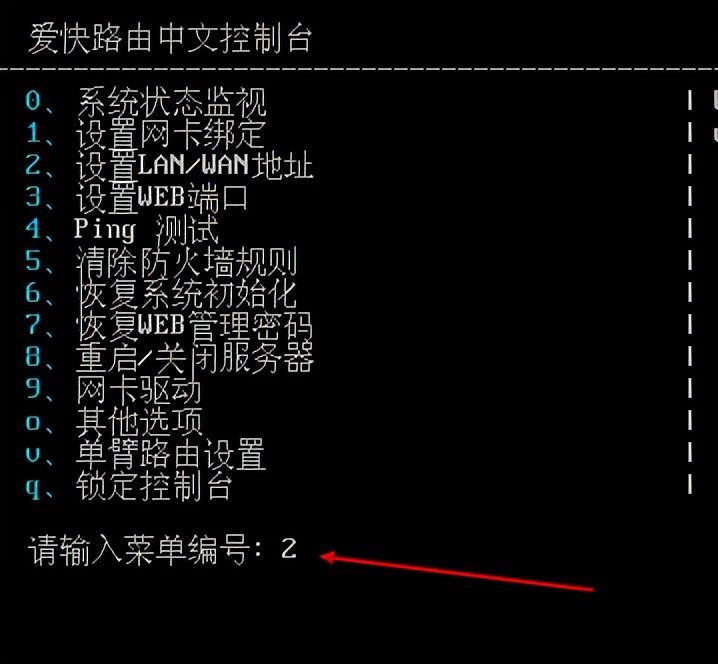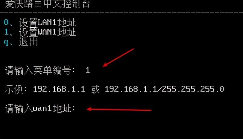 - 定义WAN口的ip地址以及网关 (地址和网关填写之前咱们记录在第三步记录的值即可),输入菜单编号“2”,设置WAN口ip地址。按要求填写咱们记录在第三步记录的值即可